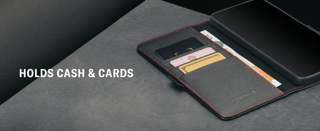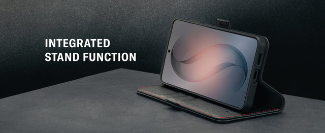 The Galaxy S26+ case features an integrated stand function facilitating horizontal screen viewing. The case also features 3 credit card slots as well as a larger compartment for notes. The side magnetic clasp ensures a secure closure while maintaining an overall slim profile.